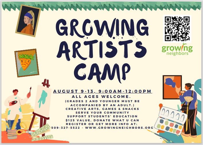Growing Artists Camp will be at Shadle Park Presbyterian Church on the corner of Rowan and Alberta from August 9-13, 9:00 am – 12:00 pm. There will be a different guest artist each day as well as a couple of art teachers present all week. Register today!